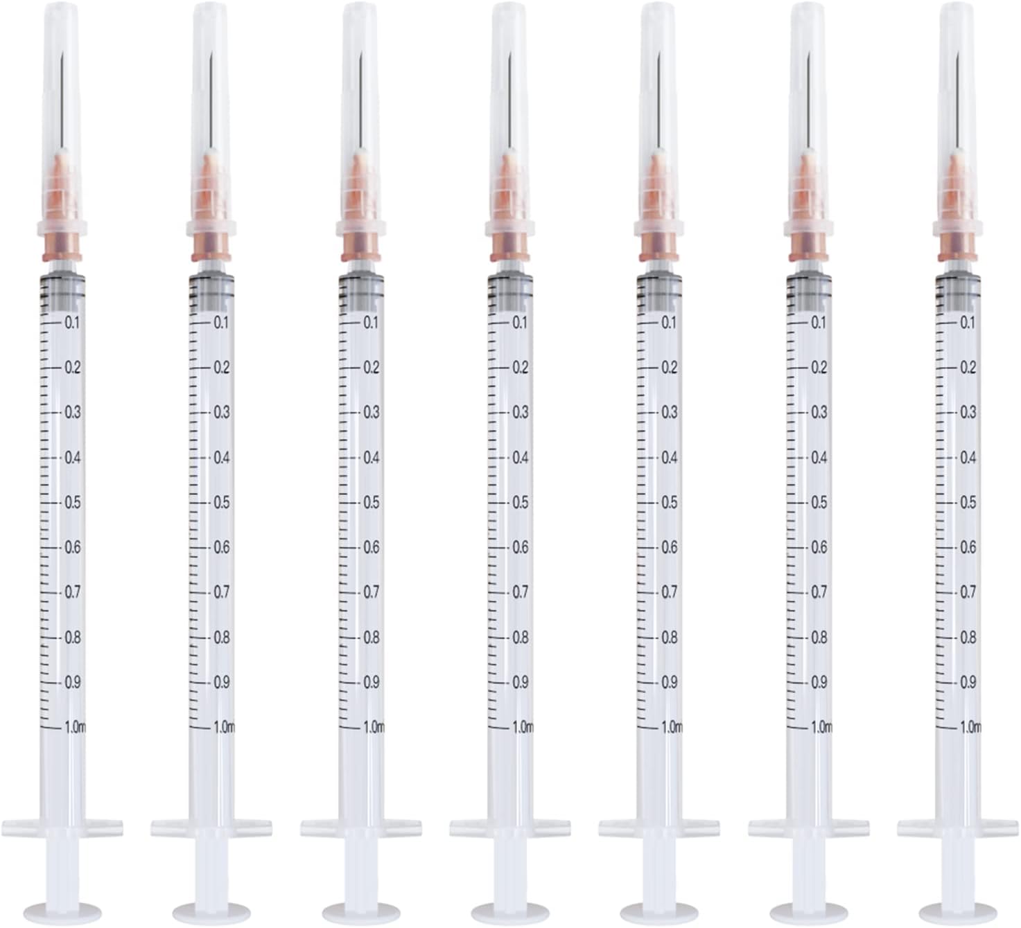 These syringes feature a 1ml (1cc) capacity barrel with clear, bold scale markings that make accurate measurements easy to read. The 25 gauge needle measures exactly 1/2 inch (12.7mm) in length. The needle gauge indicates an outer diameter of approximately 0.5mm, making it thin enough for precise applications while remaining durable for repeated penetration through septa or into containers. Each syringe is constructed from medical-grade plastic that’s wear resistant with good sealing properties to prevent air leaks.