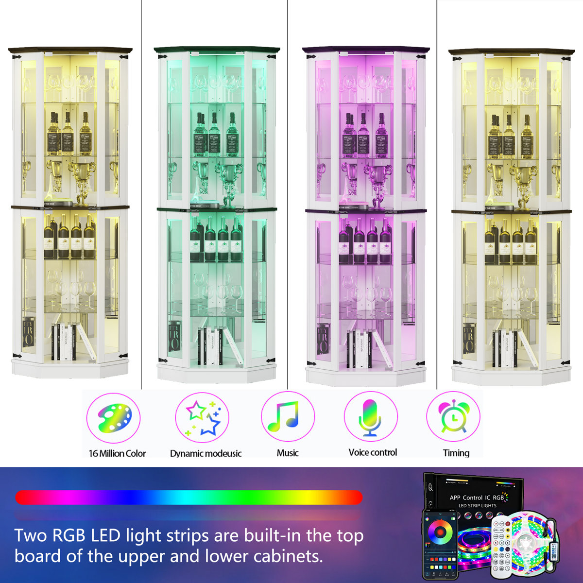 71” Farmhouse Glass Display Curio Cabinet with LED Lights, Tempered Glass Doors and 6 Adjustable Shelves, Floor Standing Display Cage with Bulb, Corner Curio Storage Rack for Bar and Liquor Storage, White