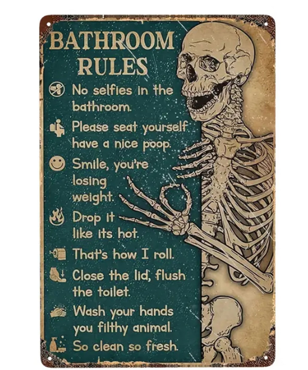 Bathroom Humor Tin Sign – Funny Skeleton Bathroom Rules Decor