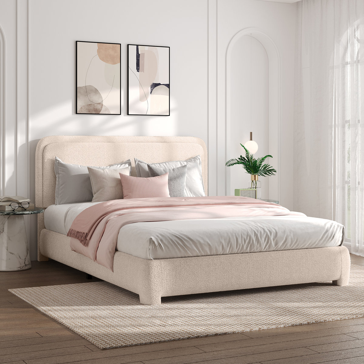 - Rounded Curved Headboard Design: The bed frame includes a soft, rounded curved headboard. This upholstered platform bed in boucle fabric has a contemporary, warm feel, making it a great addition to any bedroom.