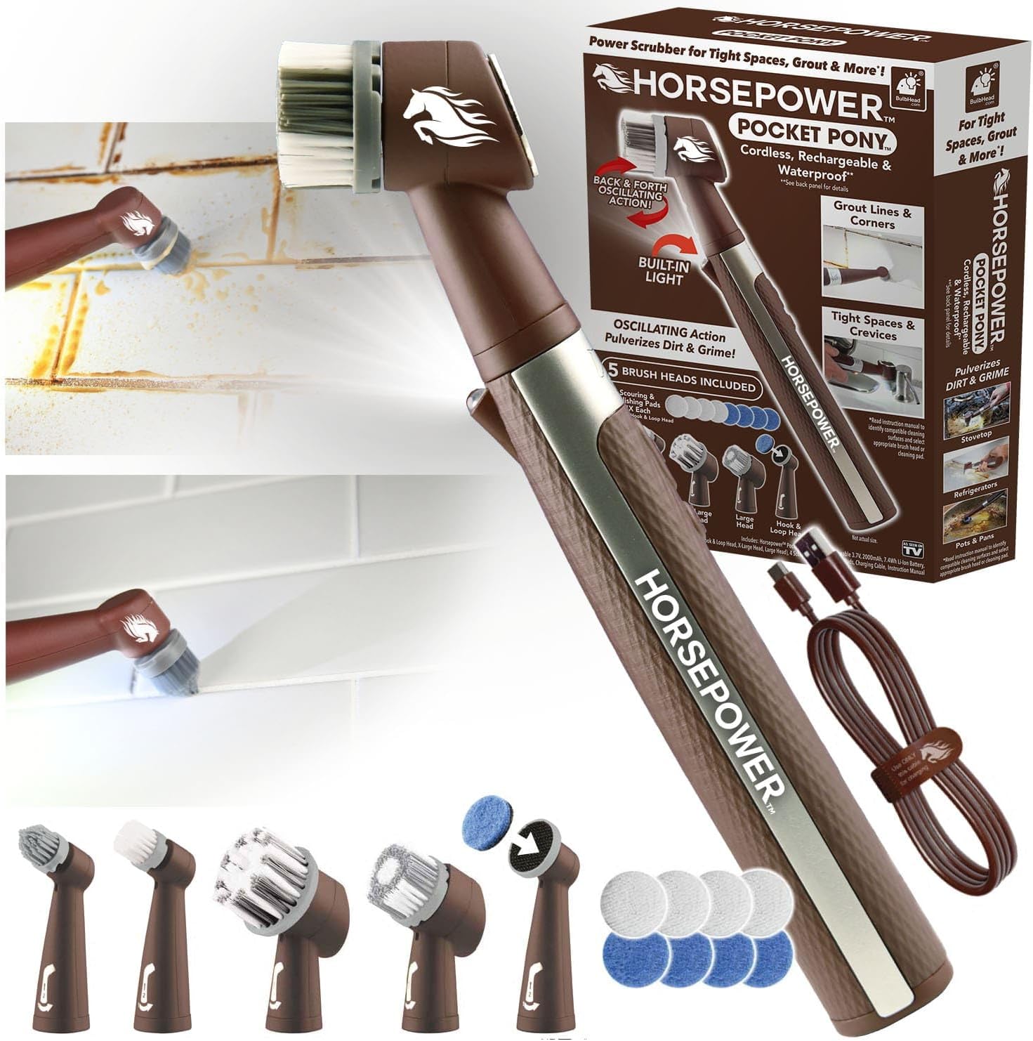 The Horsepower Pocket Pony isn’t just for grout lines. This versatile cleaning tool has five specialized brush heads to cater to every surface and mess. The device comes with various attachments tailored for different cleaning needs, making it adaptable for multiple tasks.