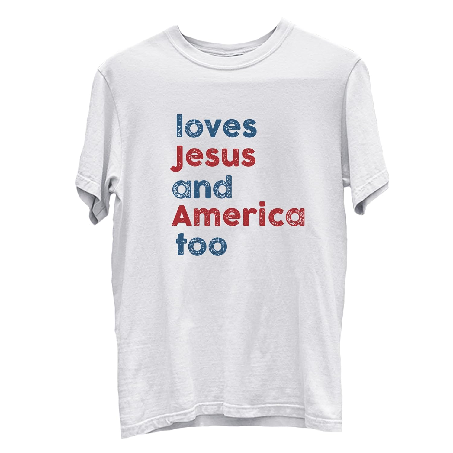 - Features a bold “Loves Jesus & America Too” graphic that makes a statement