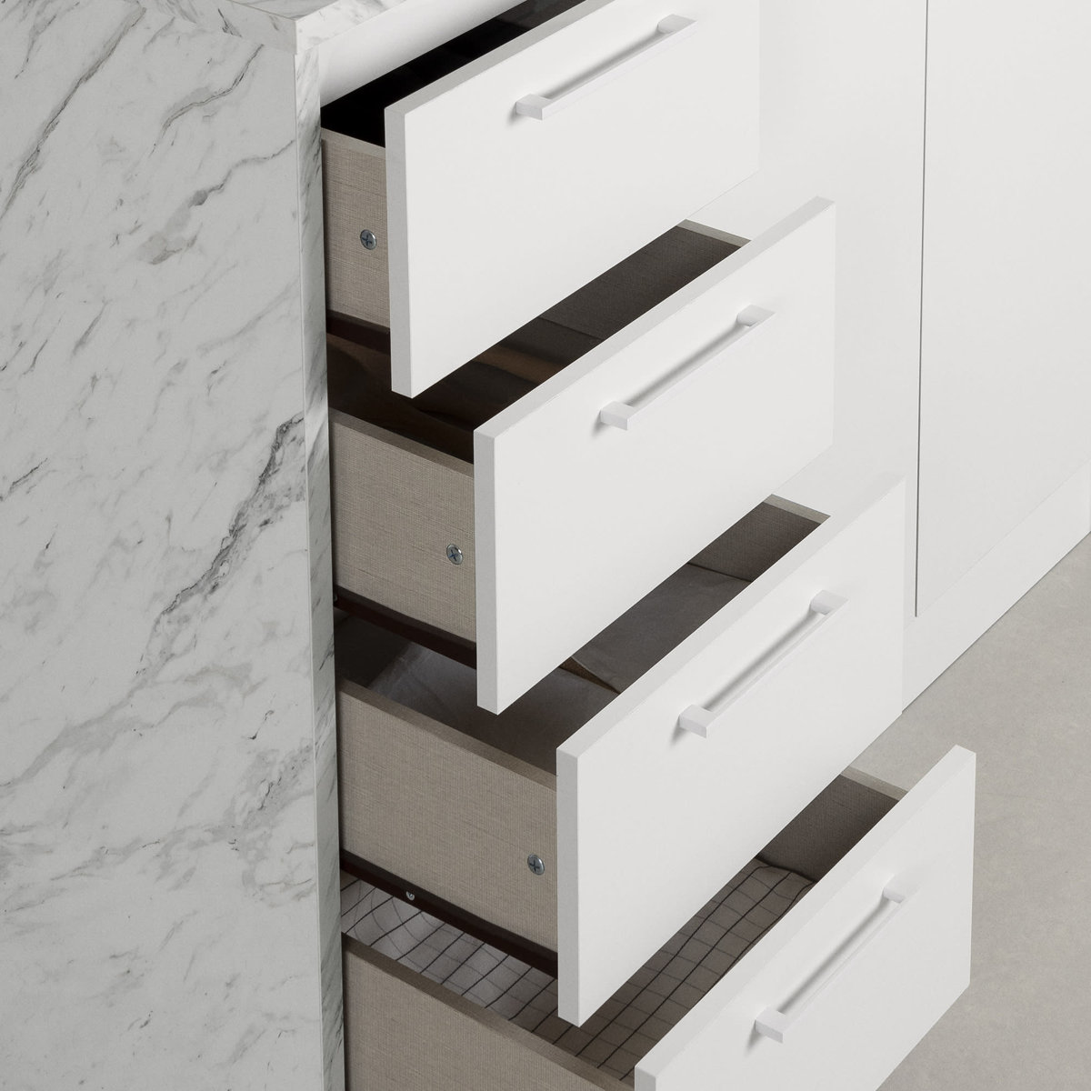 If kitchen space is tight, this island will quickly become your go-to. Whether you live in a house, a compact apartment, or a condo, its compact size lets it fit easily in the center of the room or up against a kitchen wall… and the generous surface gives you plenty of room to prep your favorite recipes. Place two stools in the open area and you’ve got a comfortable spot for breakfast or drinks with friends. No doubt: this counter will be the focal point of your room! A functional kitchen is what everyone wants. This island includes four drawers on metal slides that are perfect for storing and organizing utensils, spices, tablecloths, and small cooking gadgets. Behind the two doors is an adjustable shelf that can be positioned at any one of four heights, so you can tailor the storage to your needs. Store food, pans, or even small appliances, and enjoy a neat, organized kitchen that makes life easier. Brighten your kitchen décor with this trendy, sophisticated Contemporary counter. Slim metal handles and a sturdy surface add a clean, distinguished look to the space. Plus: it’s made of melamine, so it resists water and scratches.