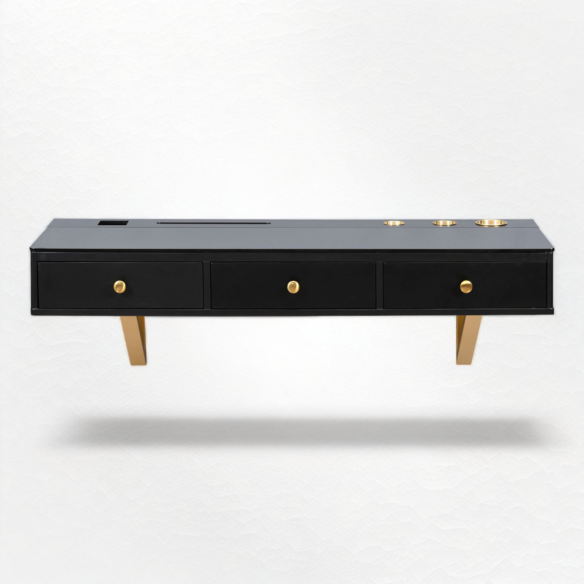 This modern makeup vanity elevates the ritual of getting ready. Its floating design is a space-saving marvel, with a sleek MDF-and-glass top held by elegant gold metal brackets. Featuring an integrated holder for electronic devices and multiple-sized containers, it’s cleverly arranged to corral hair dryers and makeup tools — an ideal pick for both makeup and hairdressing needs. The wall-mounted setup lets you choose the height for ergonomic comfort. This piece doesn’t just fit into your lifestyle; it enhances it, blending practical function with thoughtful design to create a personal styling station that’s distinctly yours.